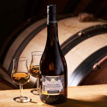 Le Marc de Bourgogne est une eau-de-vie traditionnelle française, issue de la distillation de marc de raisin titrant à 40%. Les marcs de raisin sont distillés dans des alambics de cuivre. Le Vieux Marc de Bourgogne VEDRENNE est ensuite élevé en fûts de chêne pendant 3 ans minimum.